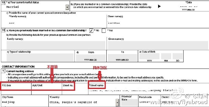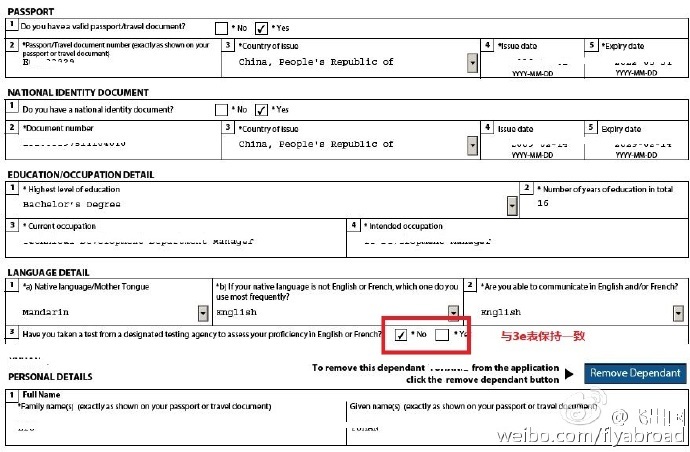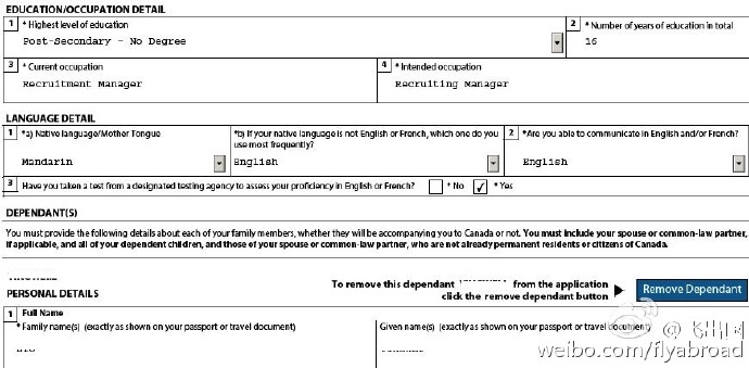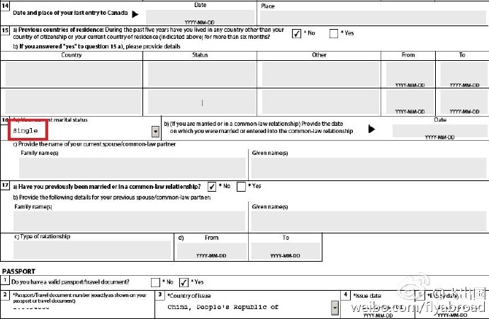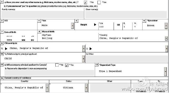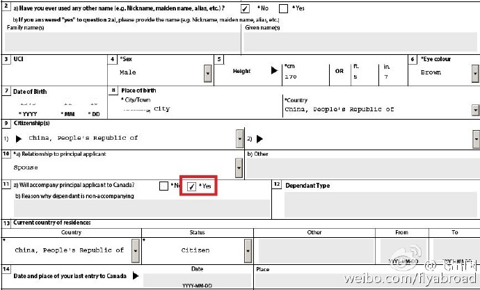 2 是否有曾用名;3 空着即可;4 性别;5 身高,填上厘米数,后面的会自动出来;6 眼睛颜色,一般都选brown;7 出生日期;8 出生城市,国家;9 公民身份,都是选中国;10 关系选Spouse;11 随行,选YES,如果不随行的话需要填写不随行原因;12 空着即可;13 当前居住国家,如实填写;14 没去过加拿大的话空着即可;15 近5年居住超过半年的国家,没有选No即可,有的话需要填写在那个国家的身份,以及详细的居住时间段;16 婚姻状况,选单身即可;17 有无婚史,选NO;