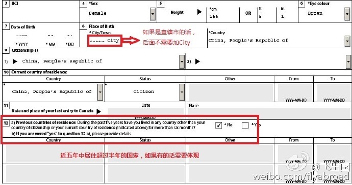 1 姓名;2 是否有曾用名;3 空着即可;4 性别;5 身高,填上厘米数,后面的会自动出来;6 眼睛颜色,一般都选brown;7 出生日期;8 出生城市,国家;9 公民身份,都是选中国;10 当前居住国家,如实填写;11 没去过加拿大的话空着即可;12 近5年居住超过半年的国家,没有选No即可,有的话需要填写在那个国家的身份,以及详细的居住时间段。