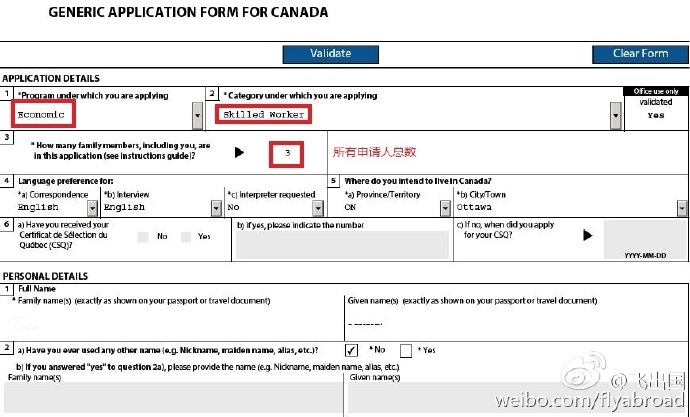 1 选择 Economic 经济类移民;2 选技术工人即Skilled Worker;3 申请人数,包括主副申及孩子;4 沟通、面试语言均选英语,是否需要翻译选No;5 打算定居的省份和城市;6 CSQ 空着即可