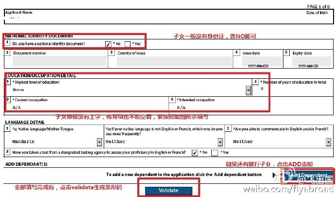 2D表(IMM0008ENU_2D)需要填写主申和所有随行人员的基本信息,全部填写完成后需要点击 Validate 生成条形码,主申需要在最后一页签字。