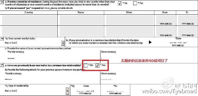 15 近5年居住超过半年的国家,没有选No即可,有的话需要填写在那个国家的身份,以及详细的居住时间段;16 婚姻状况,已婚需要填写结婚证上的结婚日期,以及配偶名字;17 有无婚史;