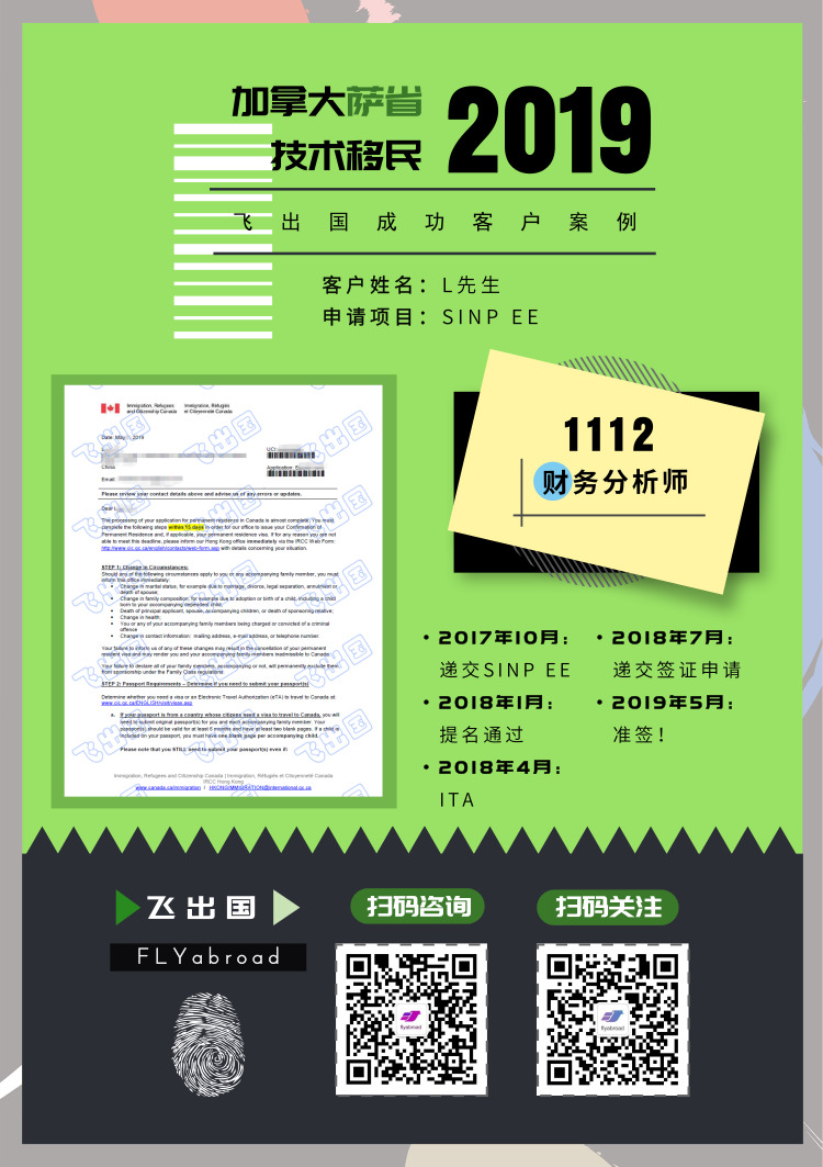 恭喜飞出国客户L先生通过萨省无雇主技术移民顺利收到大信封!提名职业为1112财务分析师,整体周期不足2年——2017年10月提交SINP EE,2018年1月底提名通过, 2018年4月ITA,2018年7月递交签证申请,2019年5月准签!