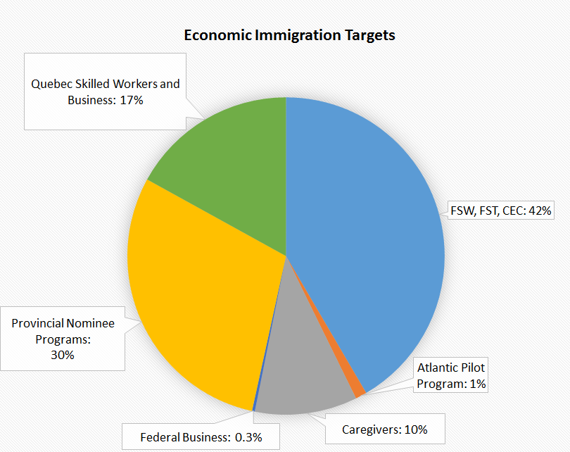 Class Program 2017 target Economic Federal Economic 73,700 Federal Caregivers 18,000 Federal Business 500 Provincial Nominee Program 51,000 Quebec Skilled Workers and Business 29,300 TOTAL 172,500
