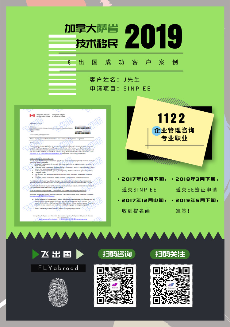 飞出国J先生,1122企业管理咨询专业职业, 2017年10月下旬递交EE下萨省申请, 12月中旬收到提名函,2018年3月下旬递交EE签证申请,2019年5月下旬准签!