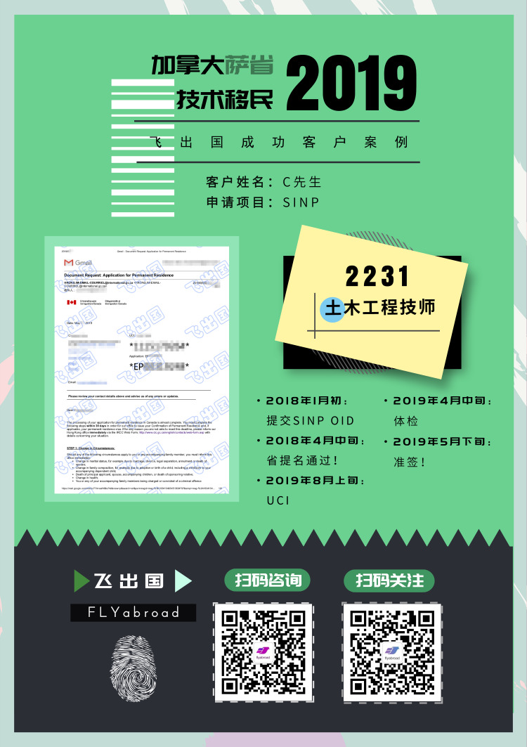 飞出国C先生,2231土木工程技师,2018年1月初递交非EE萨省,4月中旬提名通过,8月上旬收到UCI,2019年4月中旬体检,5月下旬收到取签信!