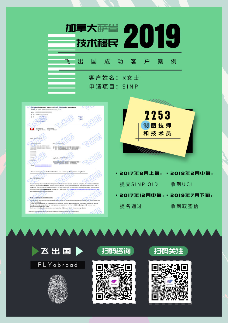 2019年7月下旬职业为2253制图技师和技术员的飞出国客户获签,申请萨省省提名OID类别丨飞出国加拿大萨省案例分享