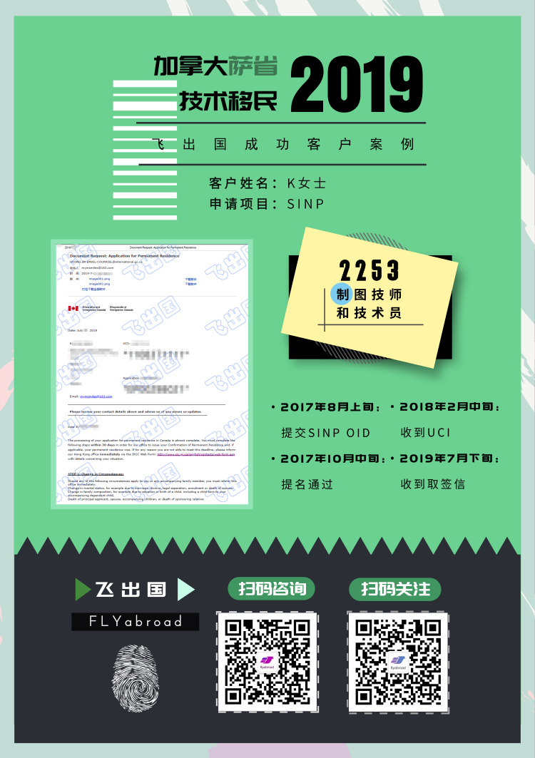 飞出国客户K女士,2253 制图技师和技术员,2017年8月上旬递交非EE萨省,10月中旬提名通过,2018年2月中旬收到UCI,2019年7月下旬收到取签信!