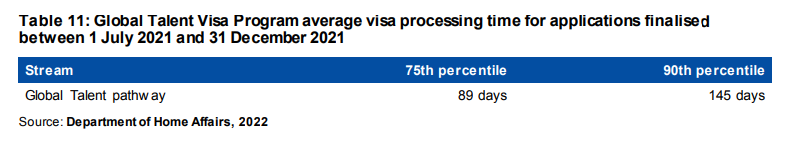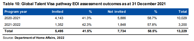 - 在2021-22财年截止到2021年12月31日之前GTI杰出人才EOI的审理中,有57.8%的EOI是没有受邀的,包括关闭的EOI以及审理完的EOI。