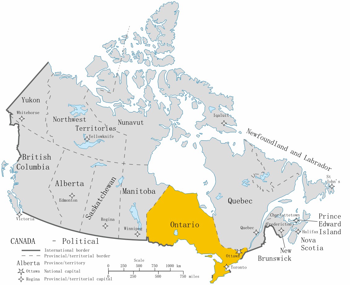 安大略省Ontario,简称安省,ON,位于加拿大东部,首府和最大的城市多伦多。是加拿大人口最多的联邦省份,也是移民人数最多的省份。经济以制造业和科技工业为主。南部气候湿润冬季寒冷、夏季湿热,北部属亚北极气候。南北部巨大的水体调节着气候,故冬夏两季气温不太低或太高,昼夜温差相对不大。