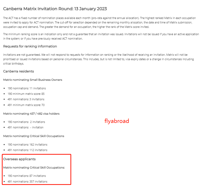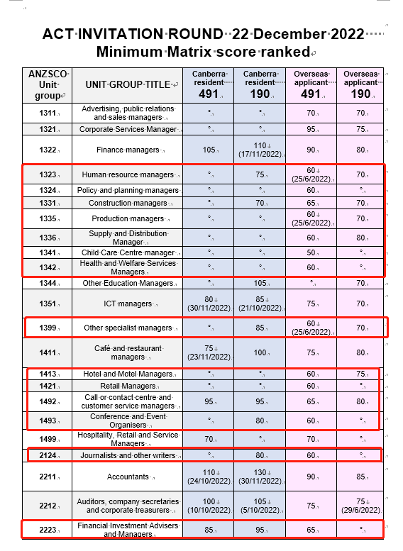 飞出国:2022年12月22日,澳洲ACT堪培拉州担保沿用之前的CANBERRA MATRIX系统,进行了2022-2023财年第11轮邀请。如下: