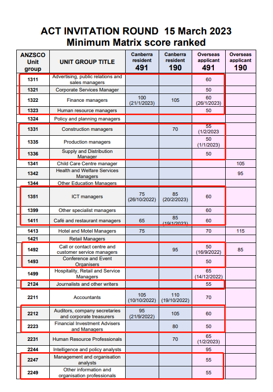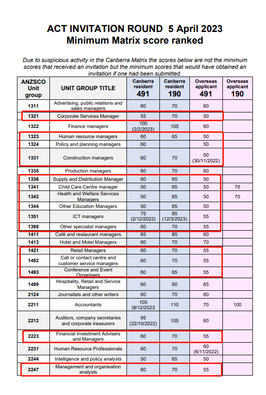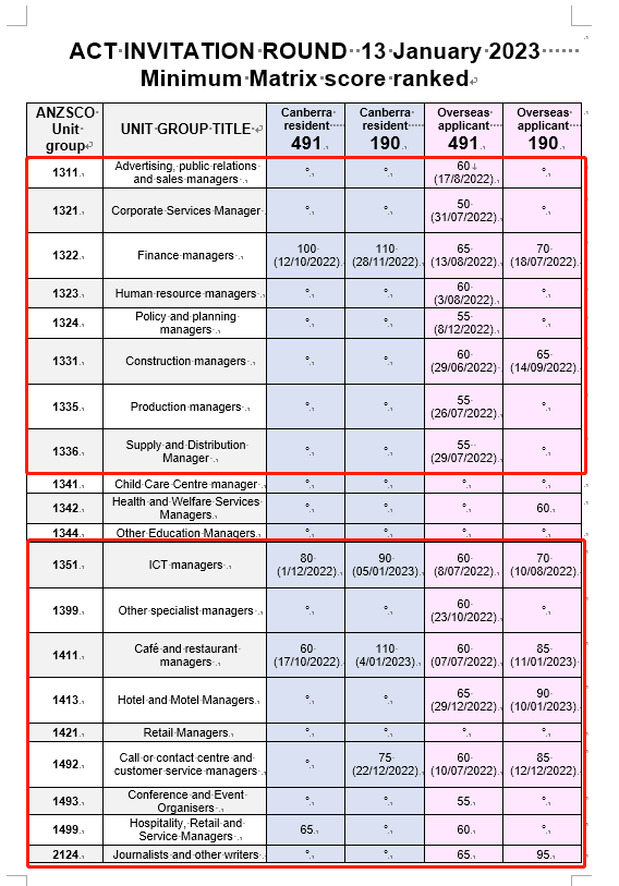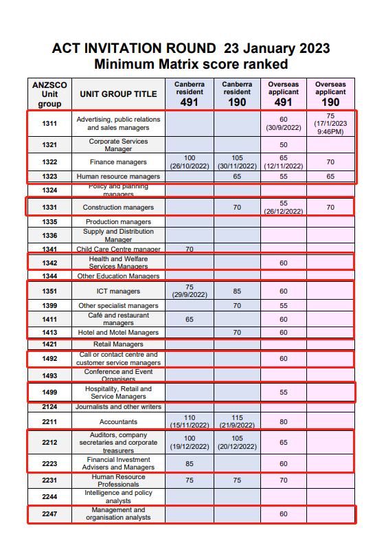 本次亮点:此次ACT Matrix 65分即可获得邀请的境外491职业有人力资源经理,生产经理,客服经理,记者,信息组织专员,职业健康顾问,建筑绘图员,电工等。