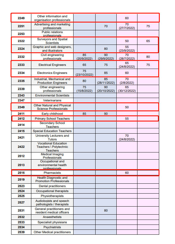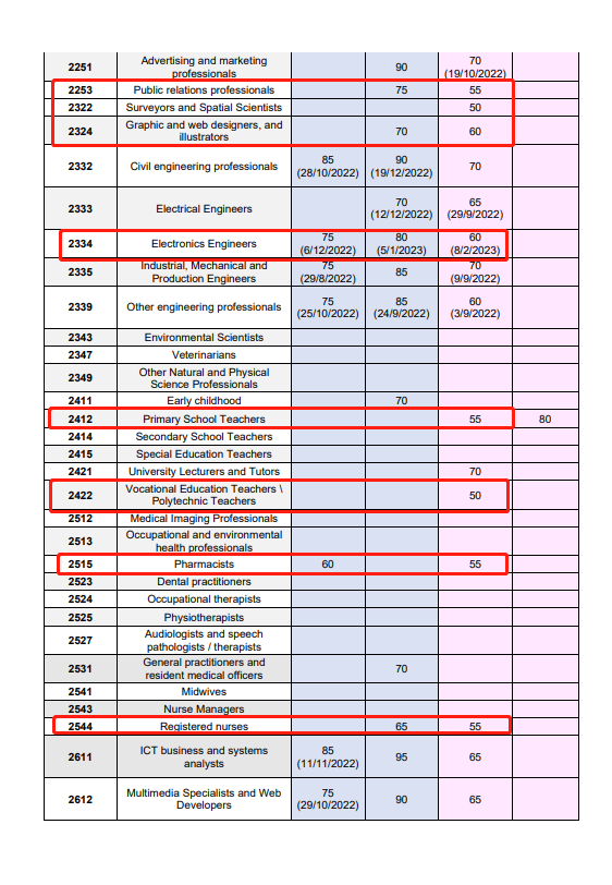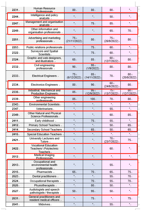 本次亮点:此次ACT Matrix最低50分就能获得邀请的职业有不少,相比之前65分最低邀请分,已经下降了15分。此次Matrix 60分或以下就邀请的职业有:供应分销经理,质量保证经理,酒店经理,零售经理,会议和活动组织者,投资顾问,公关专员,平面设计师,职业教师,电子工程师,幼儿中心经理,政策分析师,建筑绘图员,小学教师,中学教师等等。