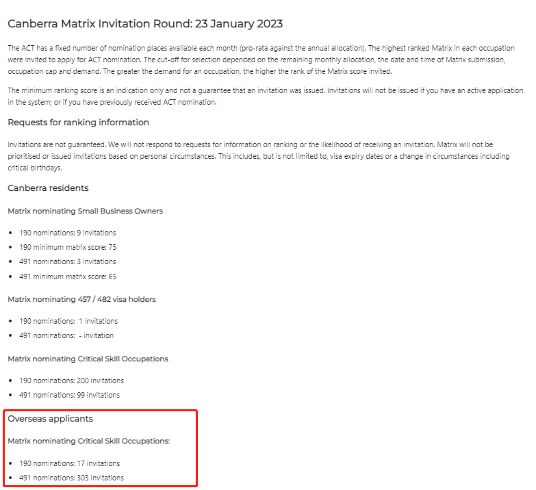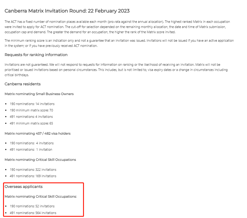 飞出国:2023年3月15日,澳洲ACT堪培拉州担保沿用之前的CANBERRA MATRIX系统,进行了2022-2023财年第14轮邀请。下一轮邀请将于4月17日左右进行。
