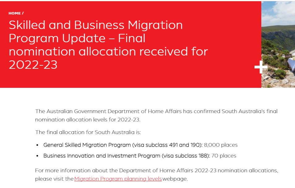 - 188A:ITA流程一直开放至2023年1月31日,之后一直到本财年结束之前都会是关闭状态。已递交ITA的188A申请人中会有一小部分可以在2023年3月收到邀请以申请南澳州担保。