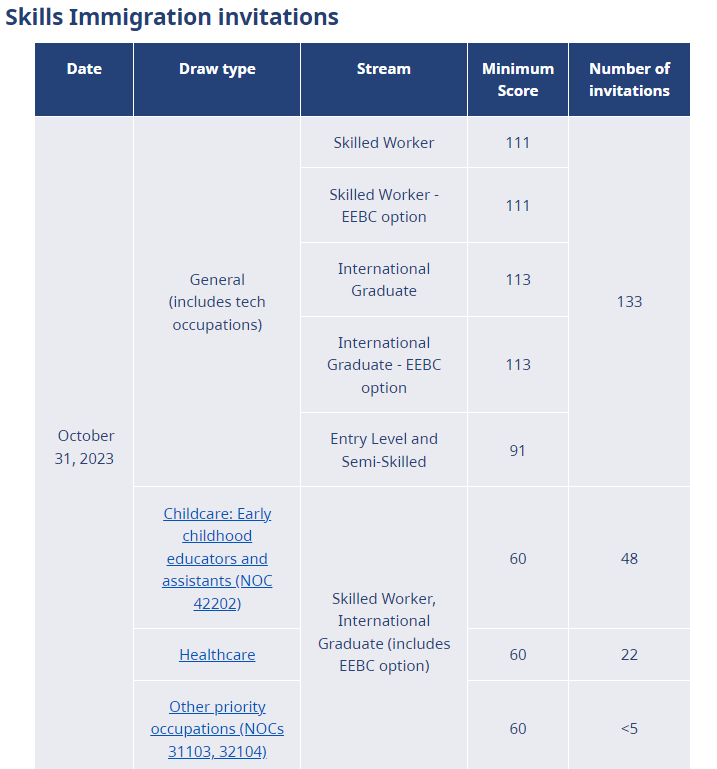 飞出国:加拿大时间2023年10月31日,BCPNP 发出新一轮邀请,邀请情况如下: