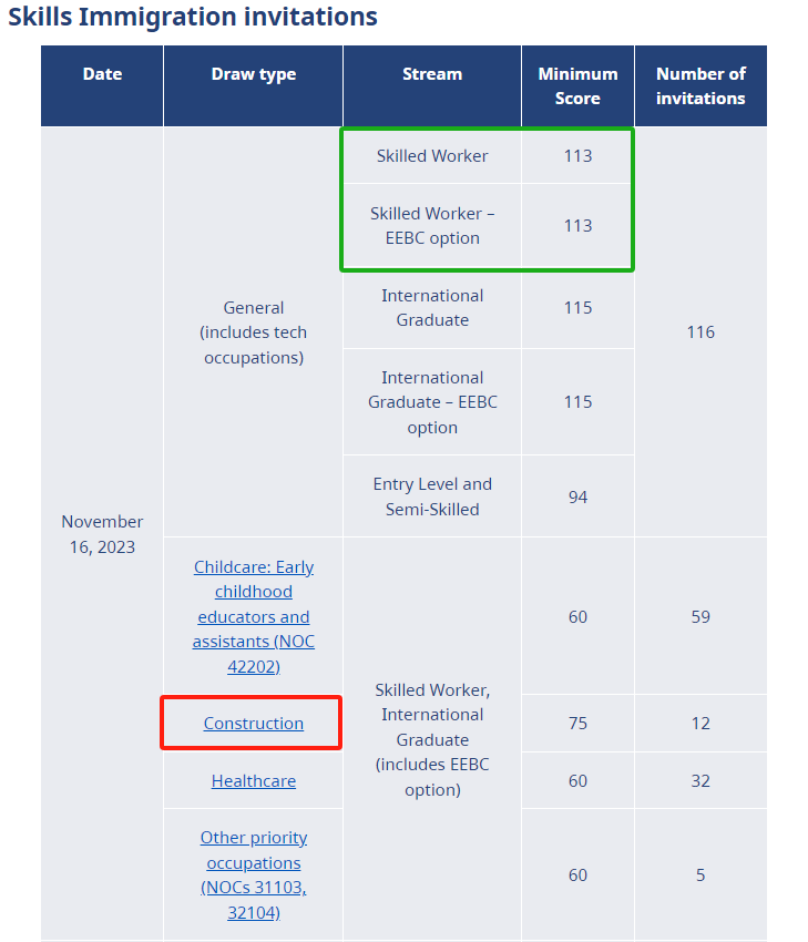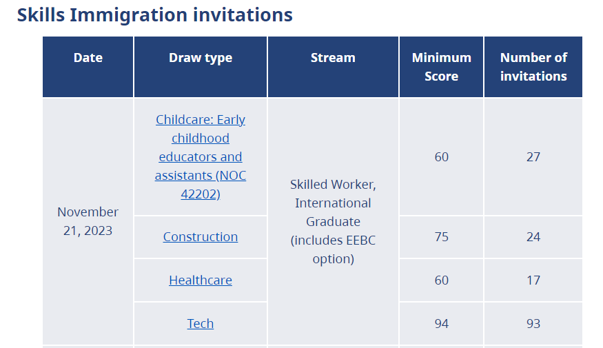 另外还向在 NOC 42202 项下针对幼儿教育工作者和助理的抽签中得分至少 60 分的技术工人和国际毕业生发出了 62 份邀请。