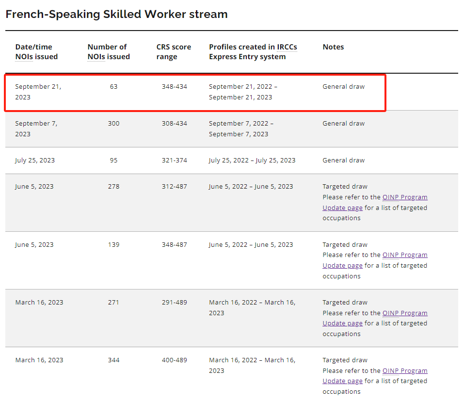 2023年9月21日,安省省提名EE法语技术工人类别向潜在候选人发出了邀请。邀请人数63人,邀请分348-434 之间;