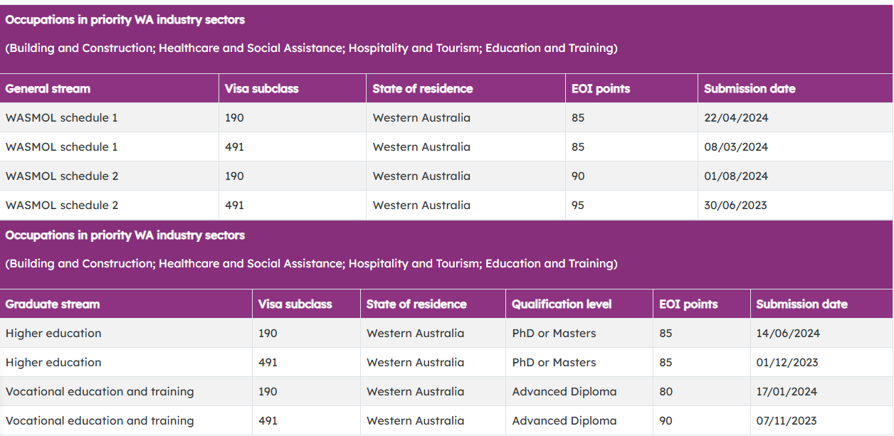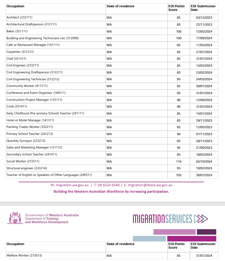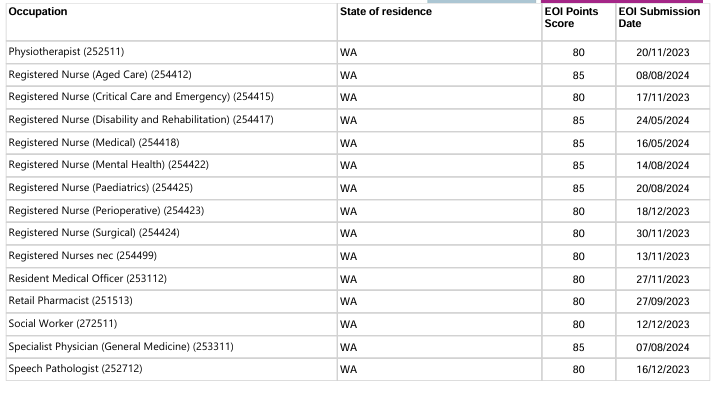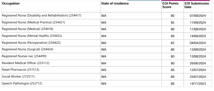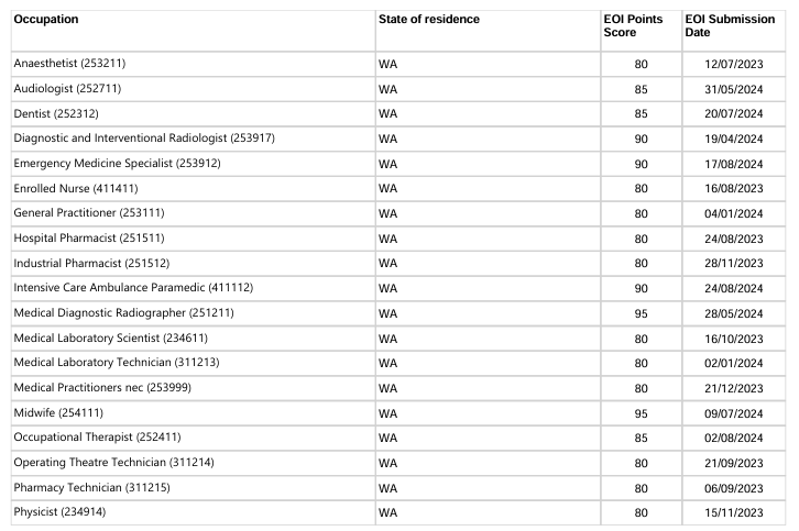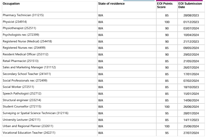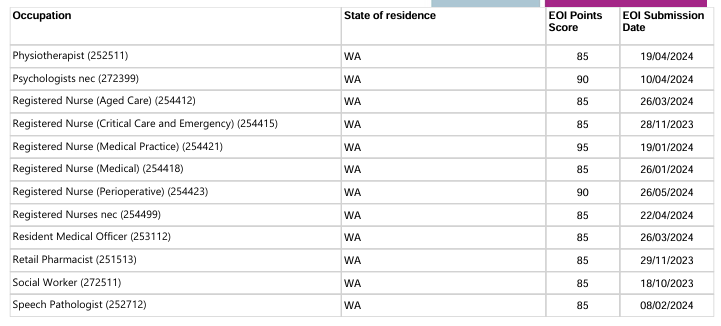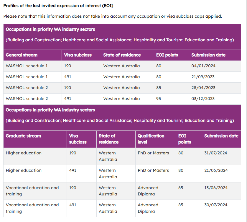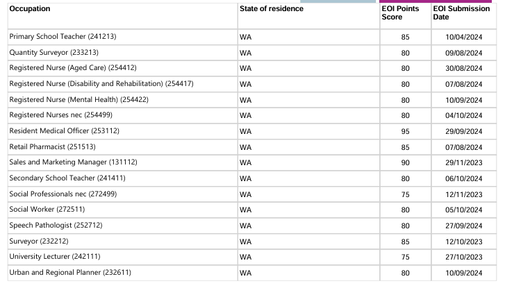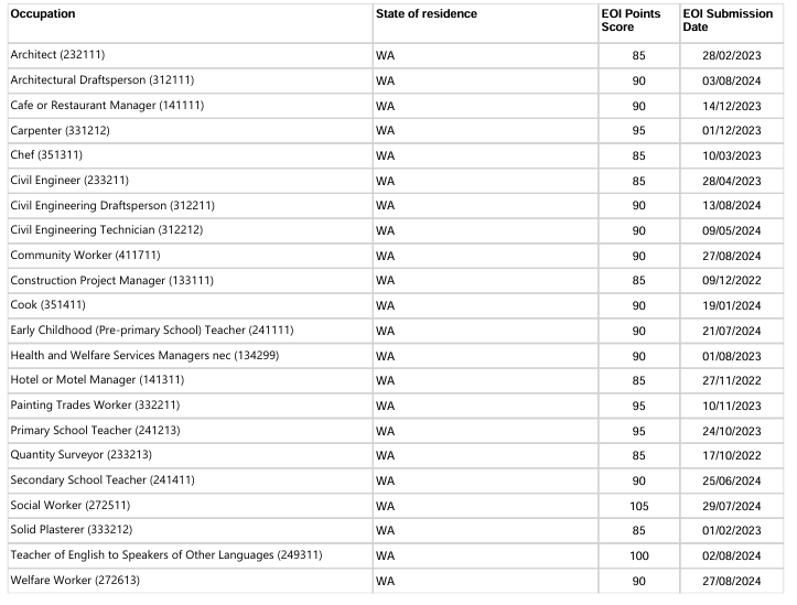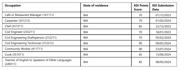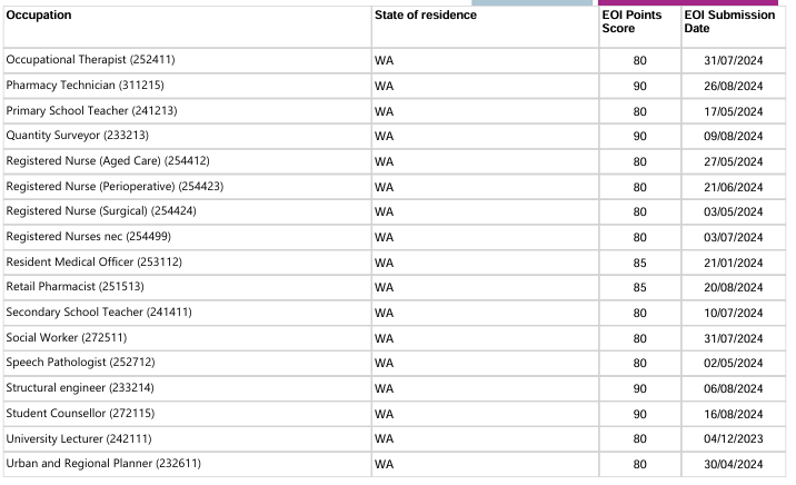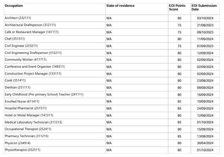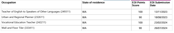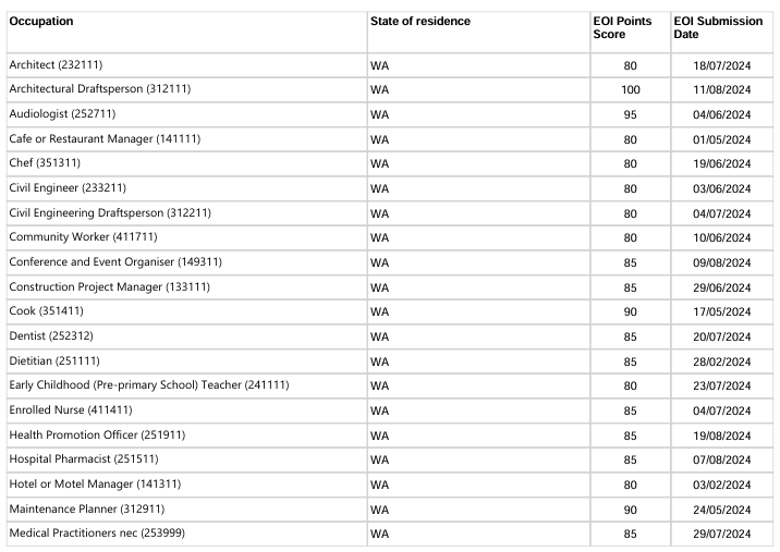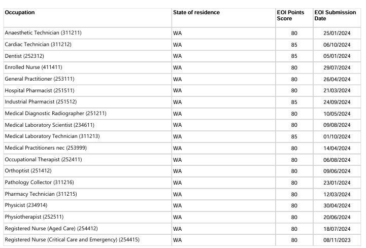 本轮邀请中西澳优先行业最低EOI邀请分情况: