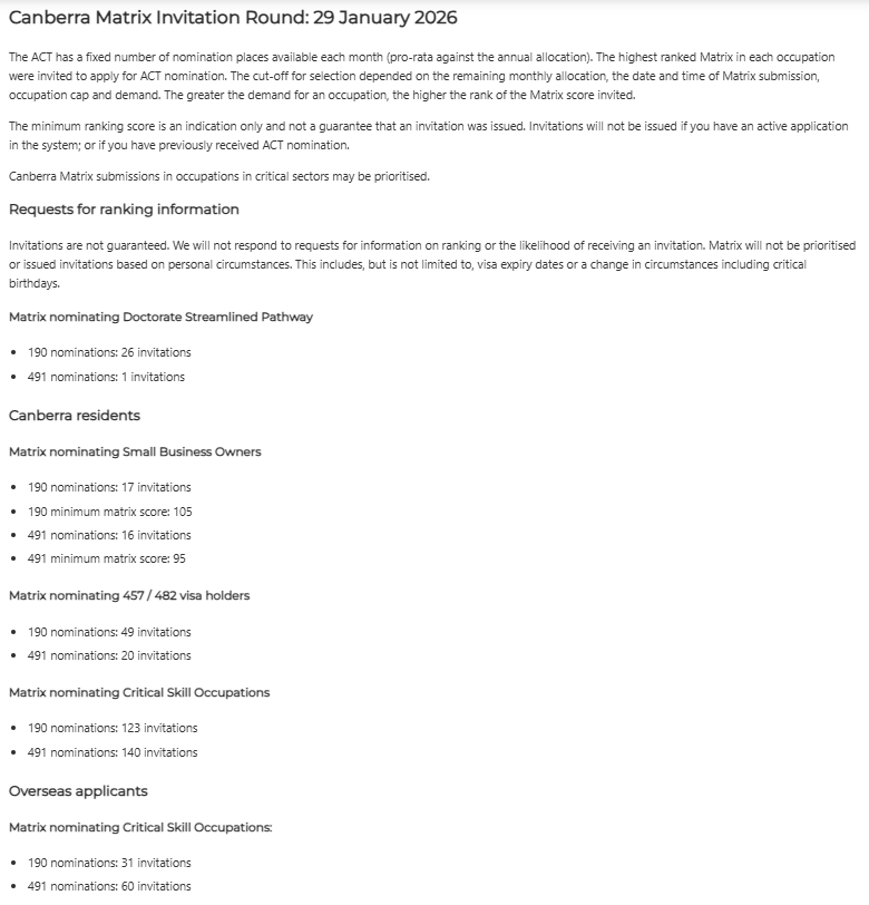 截止到本轮邀请,ACT堪培拉暂时只收到移民局给的165个临时配额,此次邀请总计发给堪培拉境内476份,澳洲境外83份邀请。