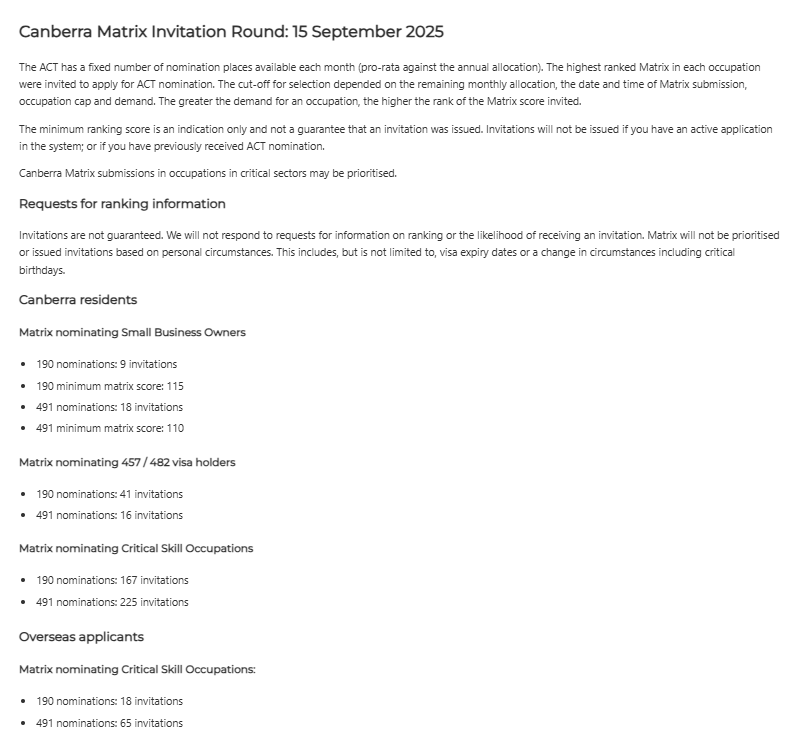 飞出国:2025年9月15日,澳洲ACT堪培拉州担保沿用之前的CANBERRA MATRIX系统,进行了2025-2026财年第1轮邀请,下一轮邀请预计要等ACT收到移民局正式的完整州担保配额后再进行发放。