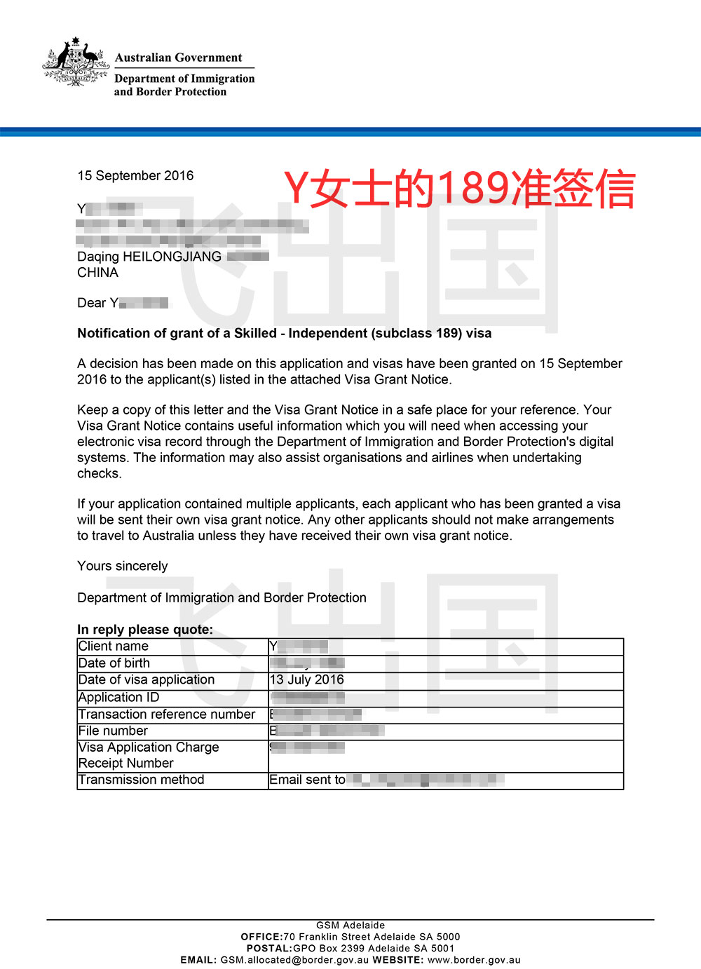 Y女士论坛分享感谢信澳洲189经历,感谢飞出国!