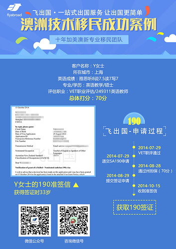 进度:2014.07.29通过VET职评,2014.07.29递交南澳190州担保申请,2014.08.28获得担保,2014.08.29递交190签证申请,2014.10.15准签!