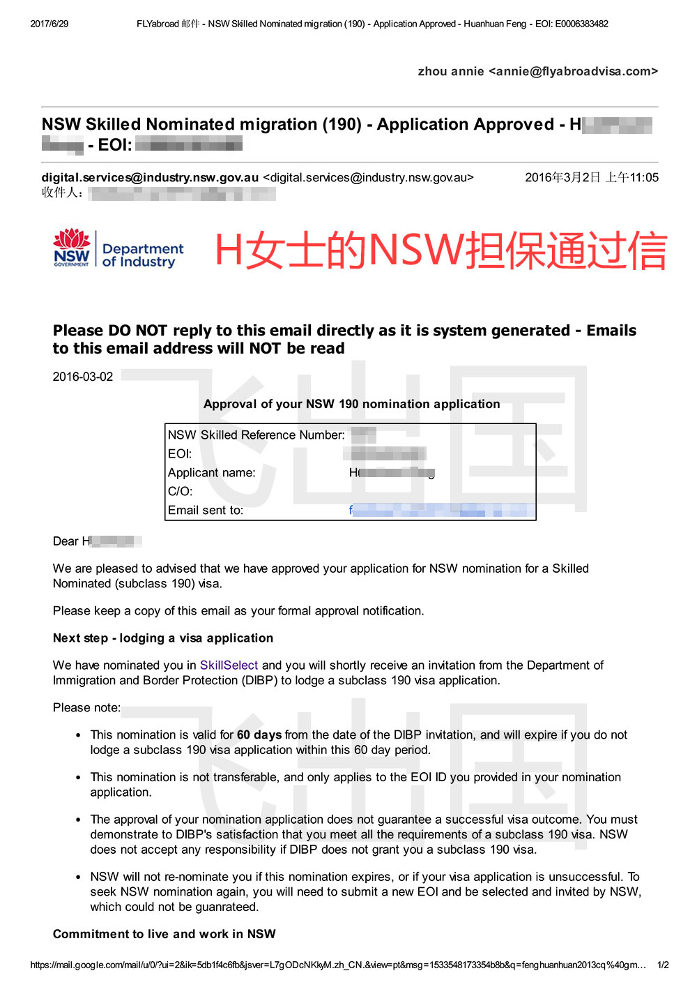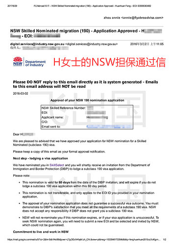 进度:2013.12.24提交VET职业评估,2014.04.15职评通过,2015.11.09提交NSWEOI(65分),2016.01.29收到邀请,2016.02.03递交申请NSW州担保,2016.03.02获得州担保,2016.03.04提交190签证申请,2016.05.25获批190准签信!