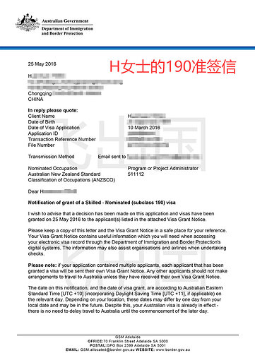 恭喜H女士顺利获得190签证!![]()