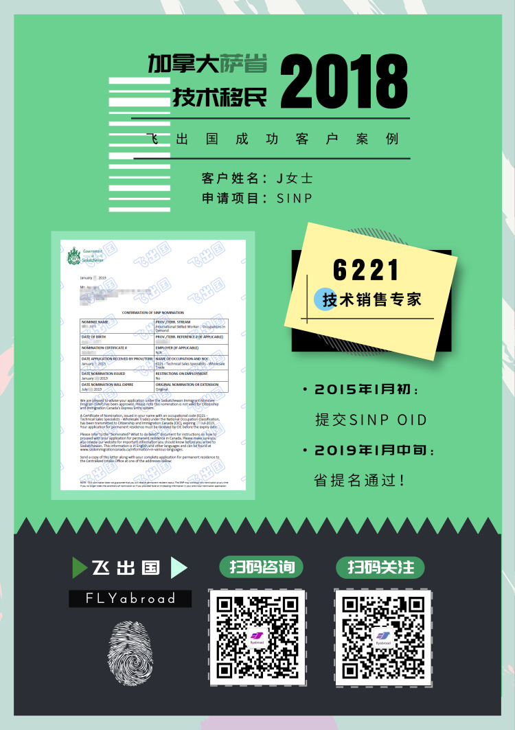 飞出国客户J女士,职业为6221技术销售。2015年1月初递交SINP OID省提名申请;2015年6月初萨省以专业与职业不相关为由提名不通过;飞出国资深顾问凭借着多年的经验对此进行了深入的分析,并于2015年6月初提交萨省Review申请,列举所学课程与从事职业的相关度;2019年1月中旬Review成功,最终喜获提名函!