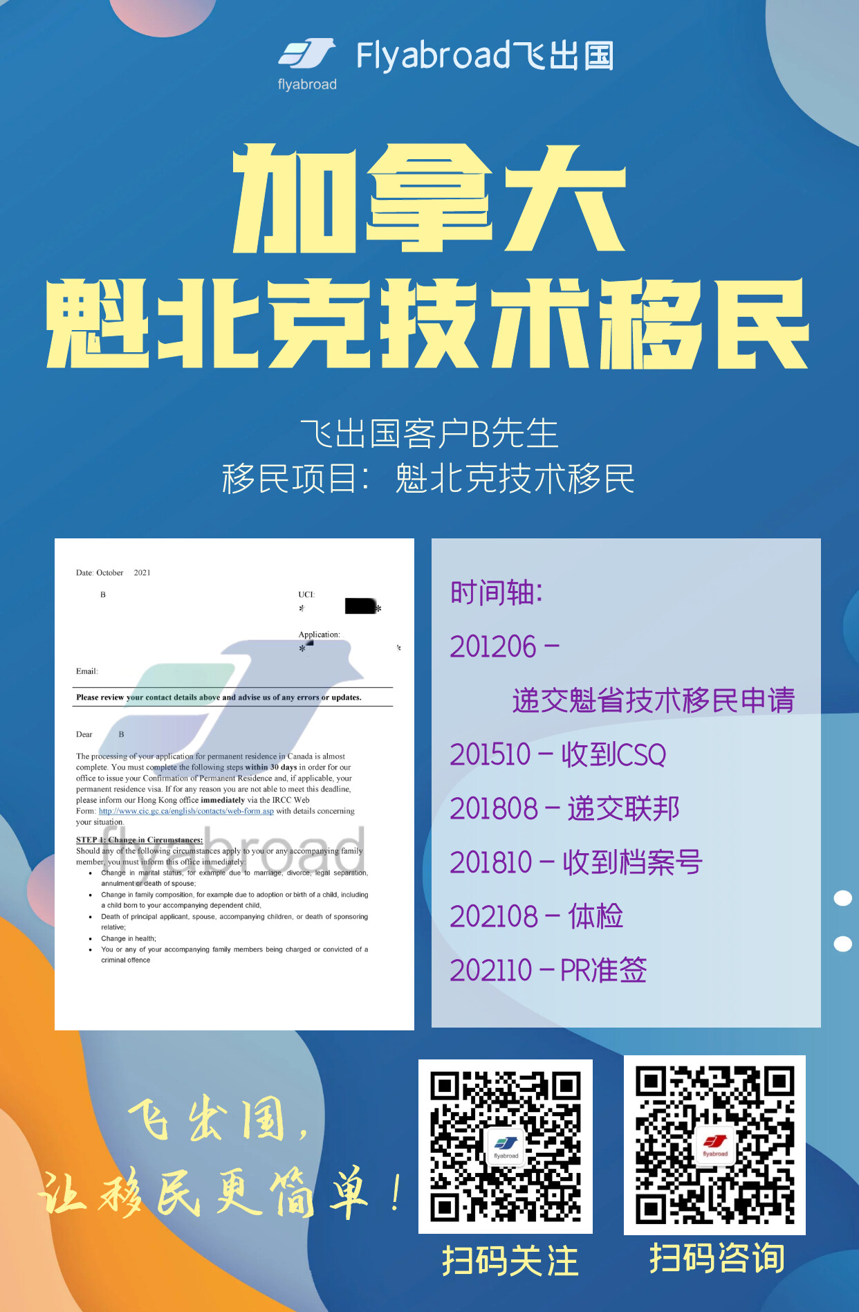 飞出国:客户B先生,2012年6月递交魁省技术移民申请,2015年10月收到CSQ,2018年8月递交联邦,10月收到档案号,2021年8月体检,10月PR准签!移民之路近十年磨一剑,只要不放弃终有云开日出时!