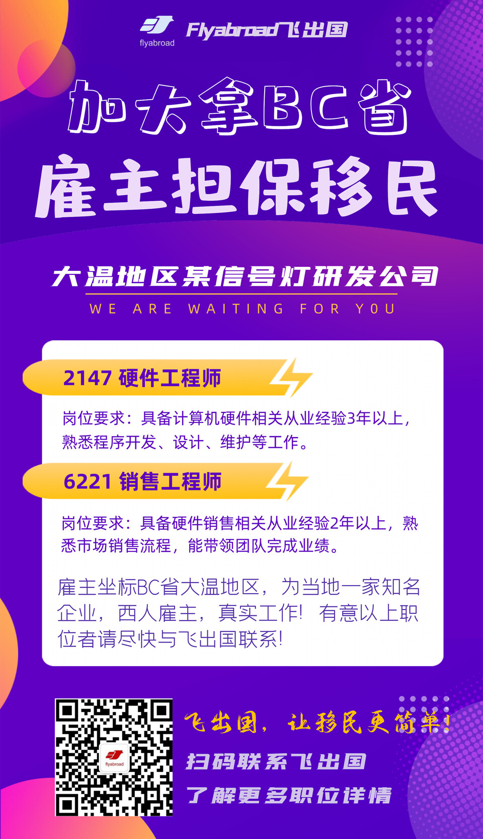 飞出国:雇主坐标BC省大温地区,为当地一家知名信号灯研发公司,现招聘2147硬件工程师及6221销售工程师职位,西人雇主,真实工作,有意以上职位者请尽快与飞出国联系!