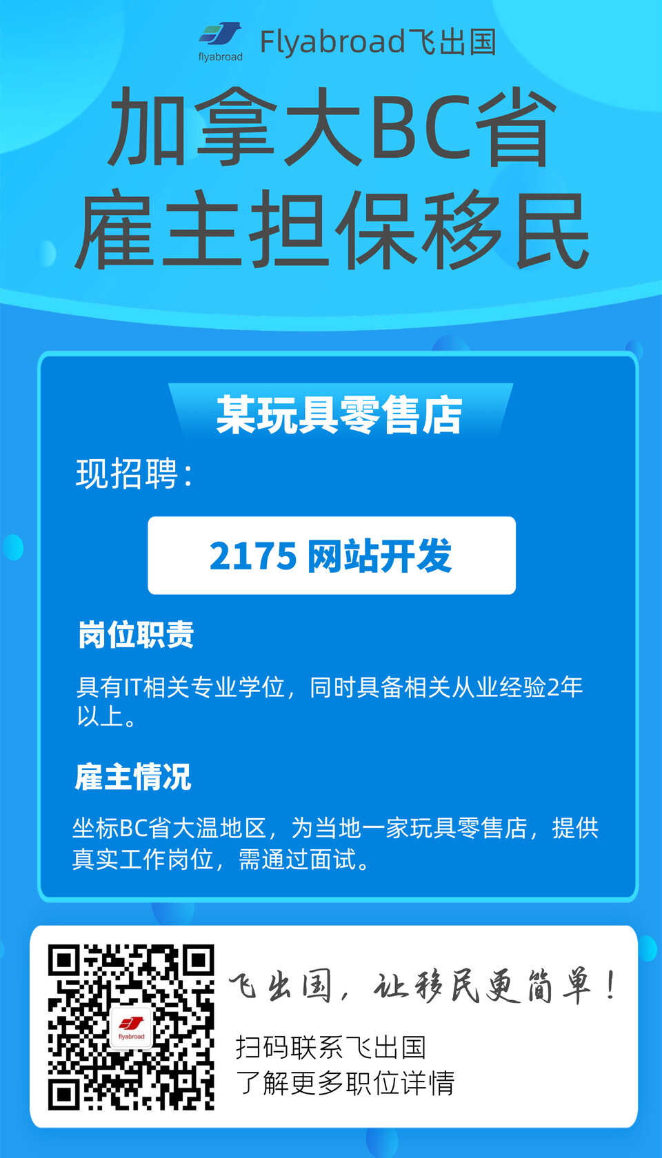 飞出国:雇主坐标BC省大温地区,为当地一家玩具零售店,现招聘2175网站开发人员,要求申请人具有IT相关专业学位,同时具备相关从业经验2年以上,雅思5分以上。雇主提供真实工作岗位,需通过面试。有意该职位者请尽快与飞出国联系!