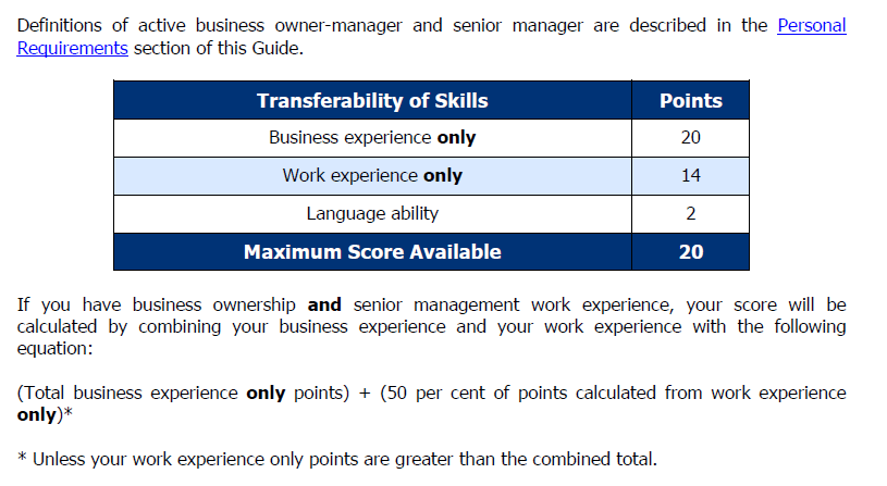 Work experience as a senior manager (no business ownership, or business ownership of less than 10 per cent): If you have worked during the past 10 years for a company/organization as an active senior manager supervising at least three full-time employees and your National Occupation Classification (NOC) is Skill Type 0 or Skill Level A.