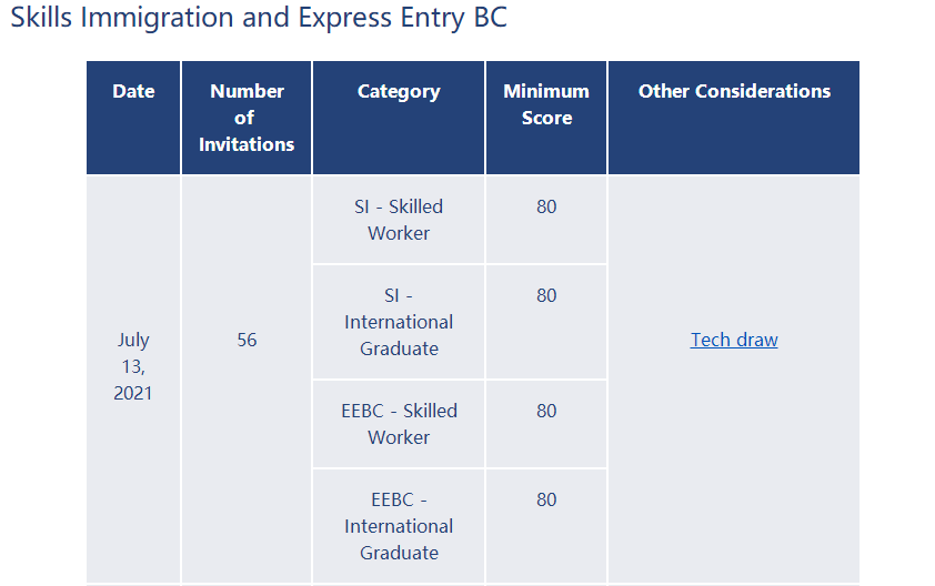 飞出国:加拿大时间2021年7月13日,BCPNP Tech Pilot Draw发出56份邀请,传统项目下技术工人类别最低邀请分80分,留学生类别最低邀请分80分,EE项目下技术工人类别最低邀请分80分,留学生类别最低邀请分80分。