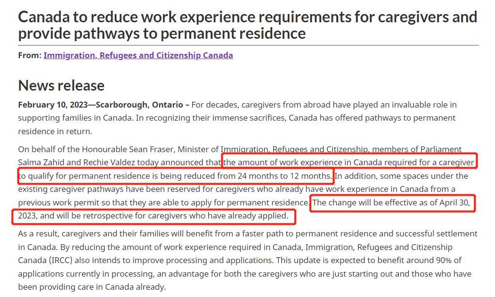 加拿大时间2023年2月10日,IRCC宣布:2023年4月30日起,加拿大保姆护理移民项目将工作经验要求从24个月减少到12个月!