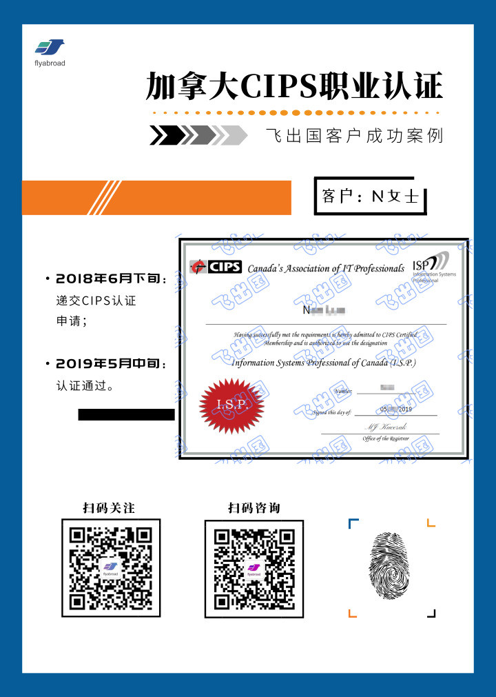 飞出国客户N先生,2173软件工程师和设计师,2018年6月下旬递交CIPS认证申请, 2019年5月中旬认证通过!
