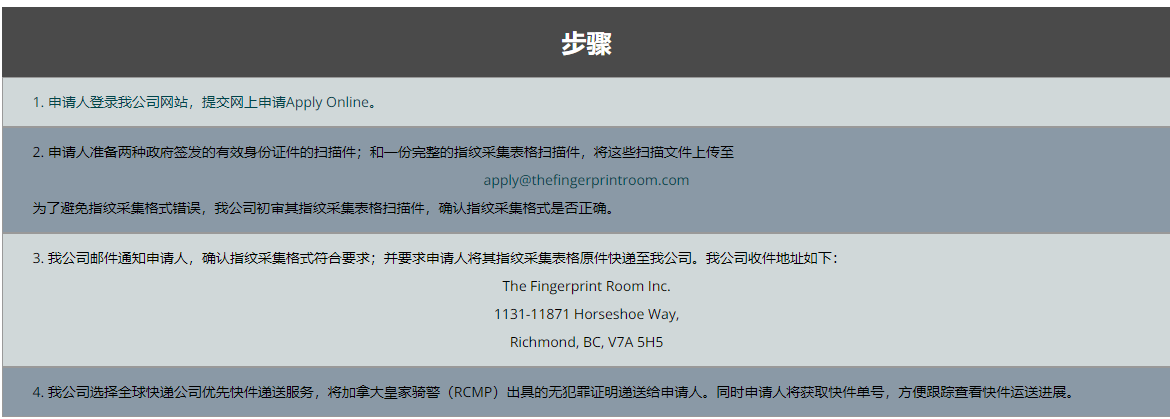 注意加拿大无犯罪证明的名称是Criminal record check, 而且在递交PR申请的时候不需要提供,可以等收到移民局的补料信再办理。还有一点特殊要求就是需要把指纹电子提交给CCRTIS。