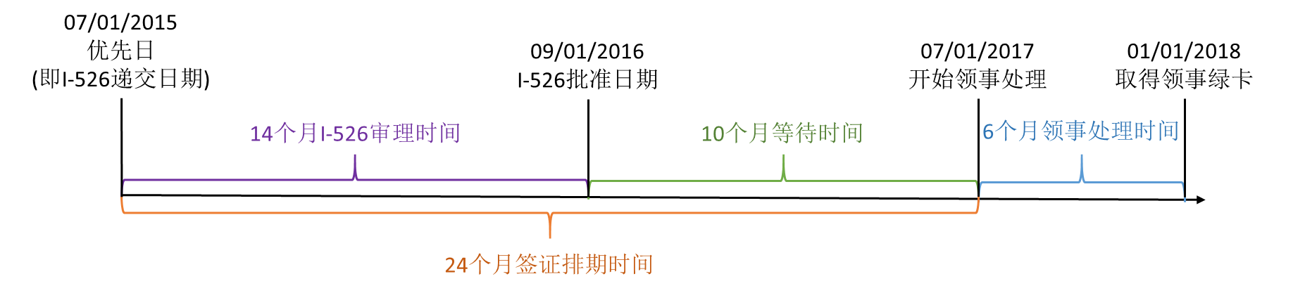 递交 I-526 后即获得优先日。假设排期是24个月,I-526正常审批是14个月。那么: