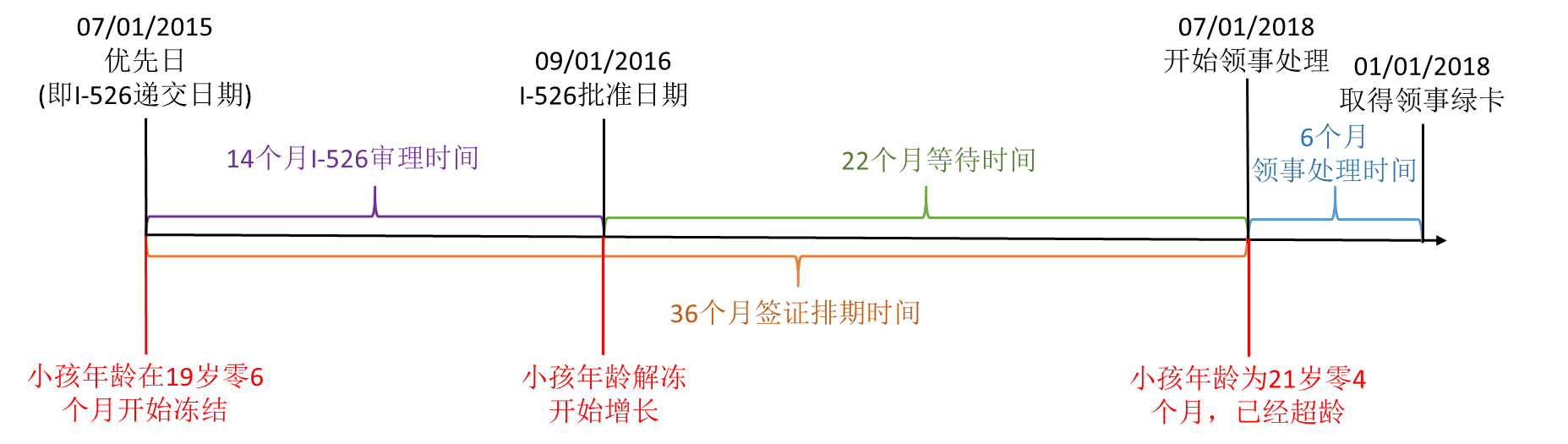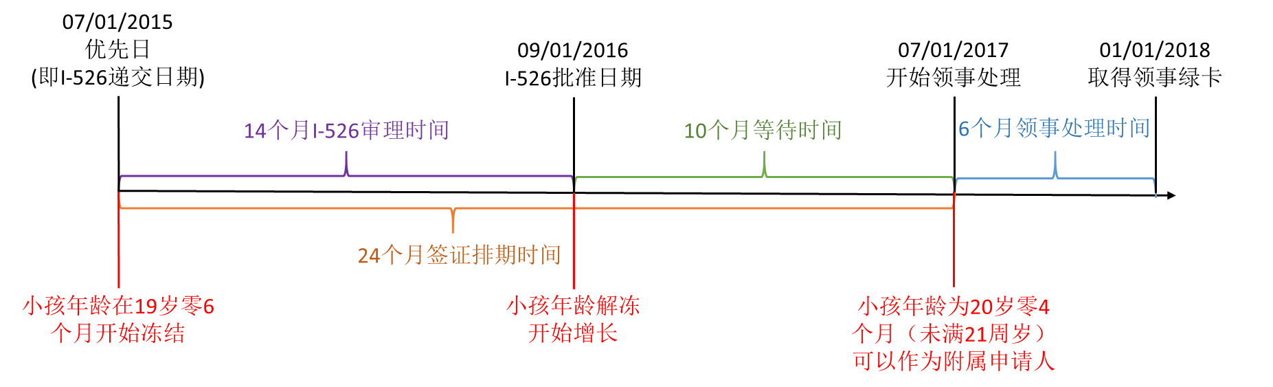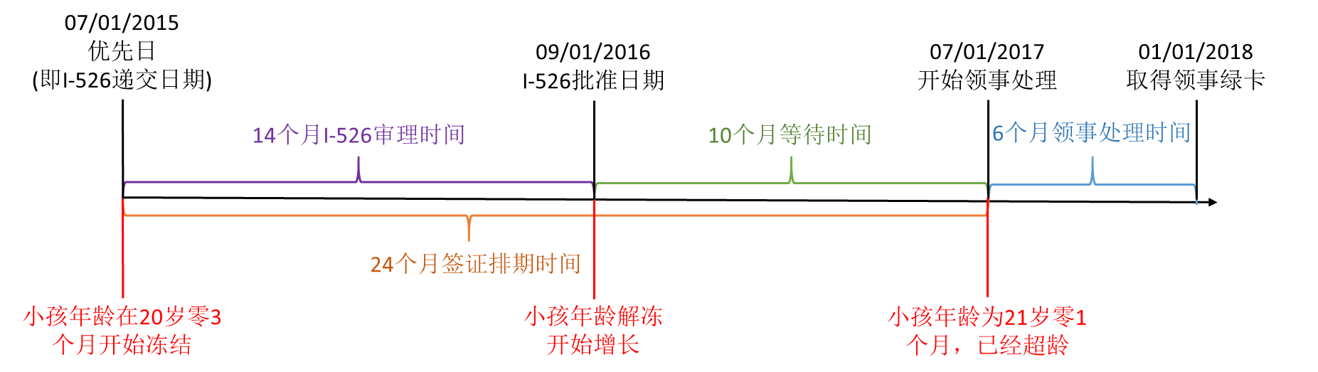 上面的日期简单介绍就是2015年7月递交I-526获得优先日,14个月获批时日期是2016年9月,这14个月收儿童身份保护法案保护,子女年龄被冻结,不被计算在内(从生理年龄里扣除)。后面有10个月的等待(24个月排期-14个月审理,还需要再等10个月),这十个月的等待期子女的年龄就不再冻结了,也就是如果孩子在递交 I-526 时已经20岁零3个月,那么就超龄了。