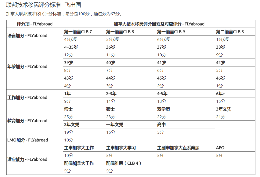 加拿大联邦技术移民评分标准 - 飞出国