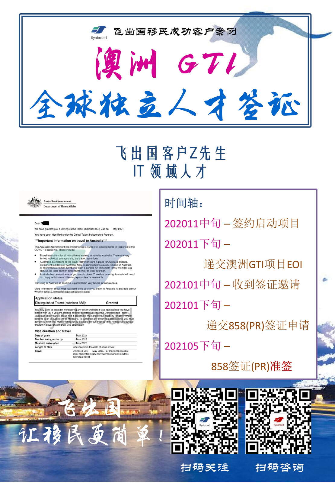 飞出国:澳洲GTI杰出人才移民项目再传捷报!飞出国客户Z先生,IT领域人才,2020年11月启动项目,2021年1月中旬收到签证邀请,5月下旬858永居签证获批!虽然名为杰出人才移民,但澳洲GTI项目并非高不可攀,在指定职业领域范围内的澳洲意向申请人都可以联系飞出国进行免费评估,让飞出国团队帮您发掘或许被忽视的申请亮点!