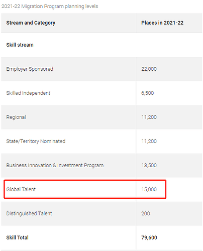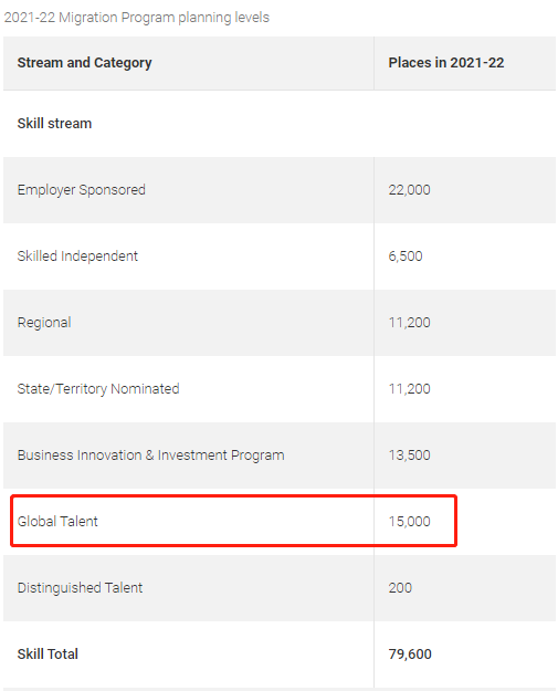 - GTI全球人才移民在2021-22财年的移民配额依旧是15000个 ,该配额数量在整体技术移民大类中算是比例非常高的了。虽然GTI全球人才移民从推出至今不到两年,但是从移民局配额来看,疫情之下,该项目仍是澳洲移民的重头戏。