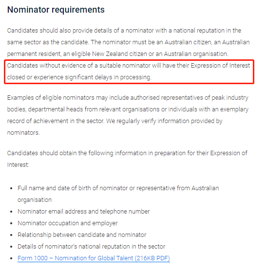 - 虽然GTI项目EOI在线系统对于澳洲推荐人一项还是可以选择YES或NO,但是从移民局最新要求来讲,已经是必须在递交EOI时提供合格的澳洲推荐人信息了。具体说来,GTI申请人在递交EOI时需要提供合格的澳洲推荐人或者机构的信息,如果递交EOI时没有推荐人,那么则有可能EOI被关闭或者审理时间大大延长。同时,另一方面,移民局也明确说了We regularly verify information provided by nominators,也就是说移民局也会和推荐人进行信息核实确认,因此, 找一位合适的澳洲推荐人对GTI的申请显得尤为重要 ,且移民局对这方面的审理也变得更加严格,而飞出国可以帮助申请人找到合适的优质的澳洲推荐人。