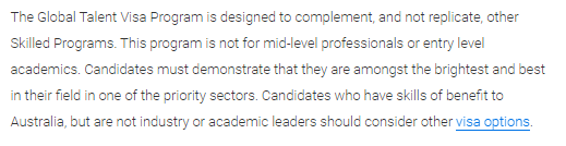 GTI全球人才项目从推出至今不到两年的时间,虽然配额从最开始的5000个涨到了15000个,但是申请人数也是一直不断倍增,毕竟一步到位澳洲PR且能快速三四个月下签的项目真是不可多得,所以申请人数众多是常理之中,而申请人中也不乏一部分实际不够移民局定义的“优秀”群体,从以下移民局的“强调”中可以看出。