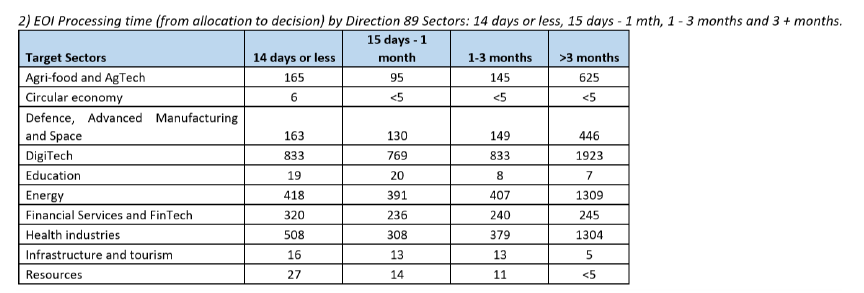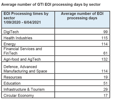- GTI项目包括两个申请阶段,一个是EOI筛选阶段,一个是签证审理阶段。其中EOI筛选阶段是至关重要也是相对审理周期较长的一个阶段,因此,申请人对该阶段的审理周期也是格外关注。而从移民局近期披露的数据来看,从平均审理周期来看,农业和食品领域的审理周期最长,有132天,其他几个审理周期将近3个月的领域有国防,先进制造和航天领域,能源领域以及医疗健康领域。而从更具体的审理周期数据来看,农业和食品领域,国防,先进制造和航天领域,数字技术领域,能源领域以及医疗健康领域都有50%左右的EOI申请的审理时间是超过了3个月的。因此,整体说来,除了新增领域比如循环经济,教育,基建和旅游业等审理周期相对较快,其他申请人数多的领域的EOI审理周期都要做好等待3个月的心理准备。