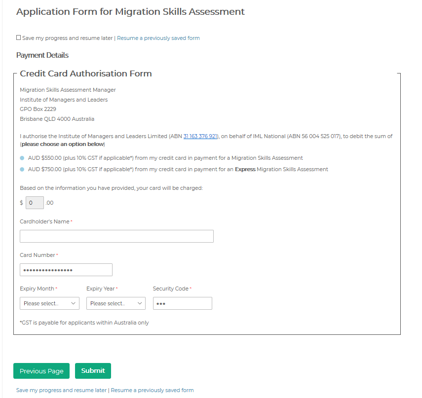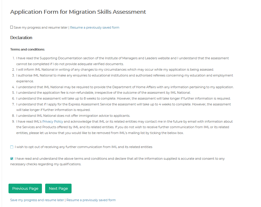 登陆IML职业评估在线申请界面:Migration Skills Assessment Application Form ,不用注册,就可以开始填写了,按照实际情况填写个人信息,完成后点击Next Page(飞出国);