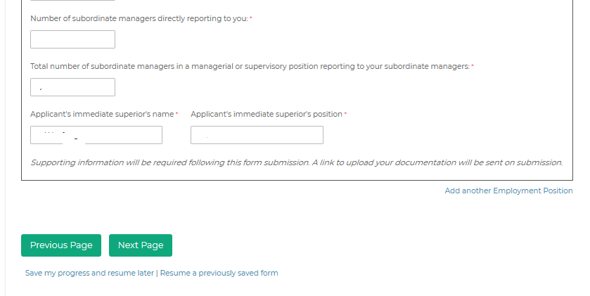 进入工作信息填写页面,从当前的工作开始填写,有多个工作履历点击右下角的Add another Employment Position,完成后点击Next Page(飞出国);