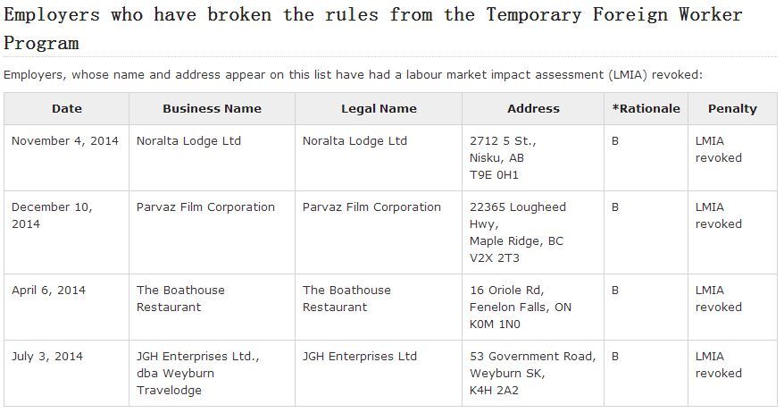 LMIA被撤销的不合格雇主列表(list of Ineligible employers)