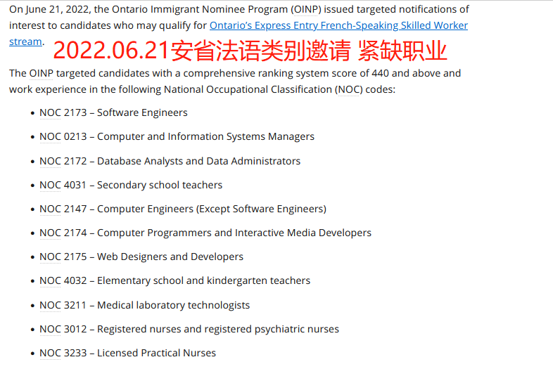2022年,一向傲娇的安省,也开始对法语类别省提名下手,不再满足于仅仅提高邀请分数,也开始限制NOC职业类别了,对于NOC 2112化学家这种冷门职业,L女士即便分数再高,等到今天,也很难呐,再次印证,移民要趁早![]()