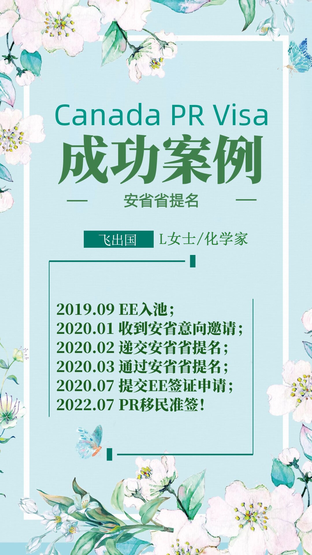 2020年1月,L女士收到安省法语类别意向邀请,2月提交省提名,3月省提名通过,省提名周期1个月,EE+600分!2020年7月在EE快速通达通道递交签证申请,按照正常审理周期,本以为6个月内会收到PR签证,谁知,因为疫情,加拿大移民局对人在海外的申请人,审理停滞